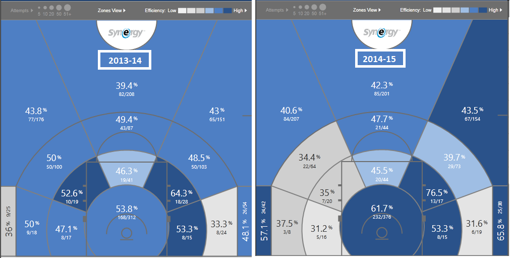 Skema serangan pick and roll ball handler tetap menjadi skema dengan frekuensi tertinggi, namun berkurang dibanding musim 2013-14. Yang menjadi menarik, menurunnya upaya tembakan yang dilakukan justru berdampak terhadap meningkatnya persentil sebesar 2 persen dibanding musim 2013-14.